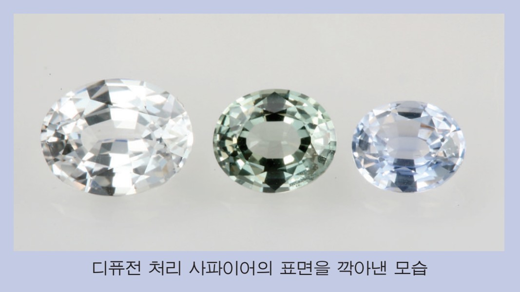 디퓨전 처리 사파이어는 표면 확산 처리이다. 영구적 화학적 처리로 표면에 청색을 코팅한 것이라고 하면 이해가 빠를 것이다. 따라서 재연마시 표면을 깎아야 할 때는 세심한 주의가 필요하다. 한마디로 표면을 깎아내면 청색이 완전 사라지기 때문이다.